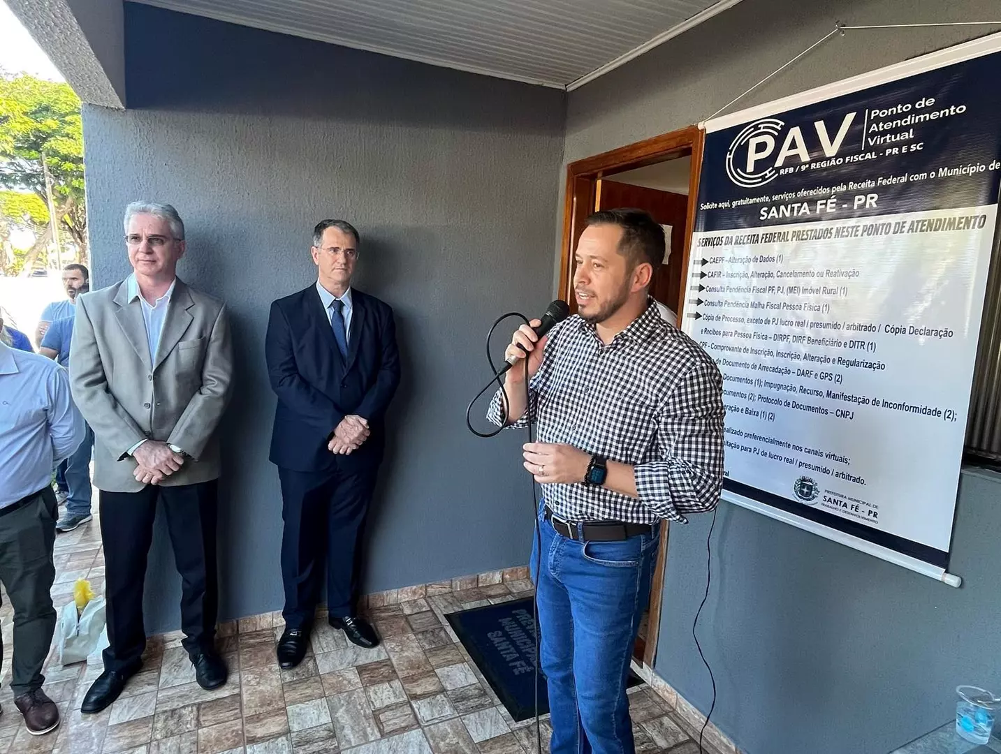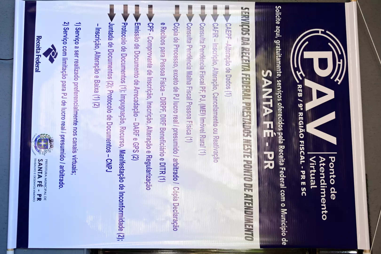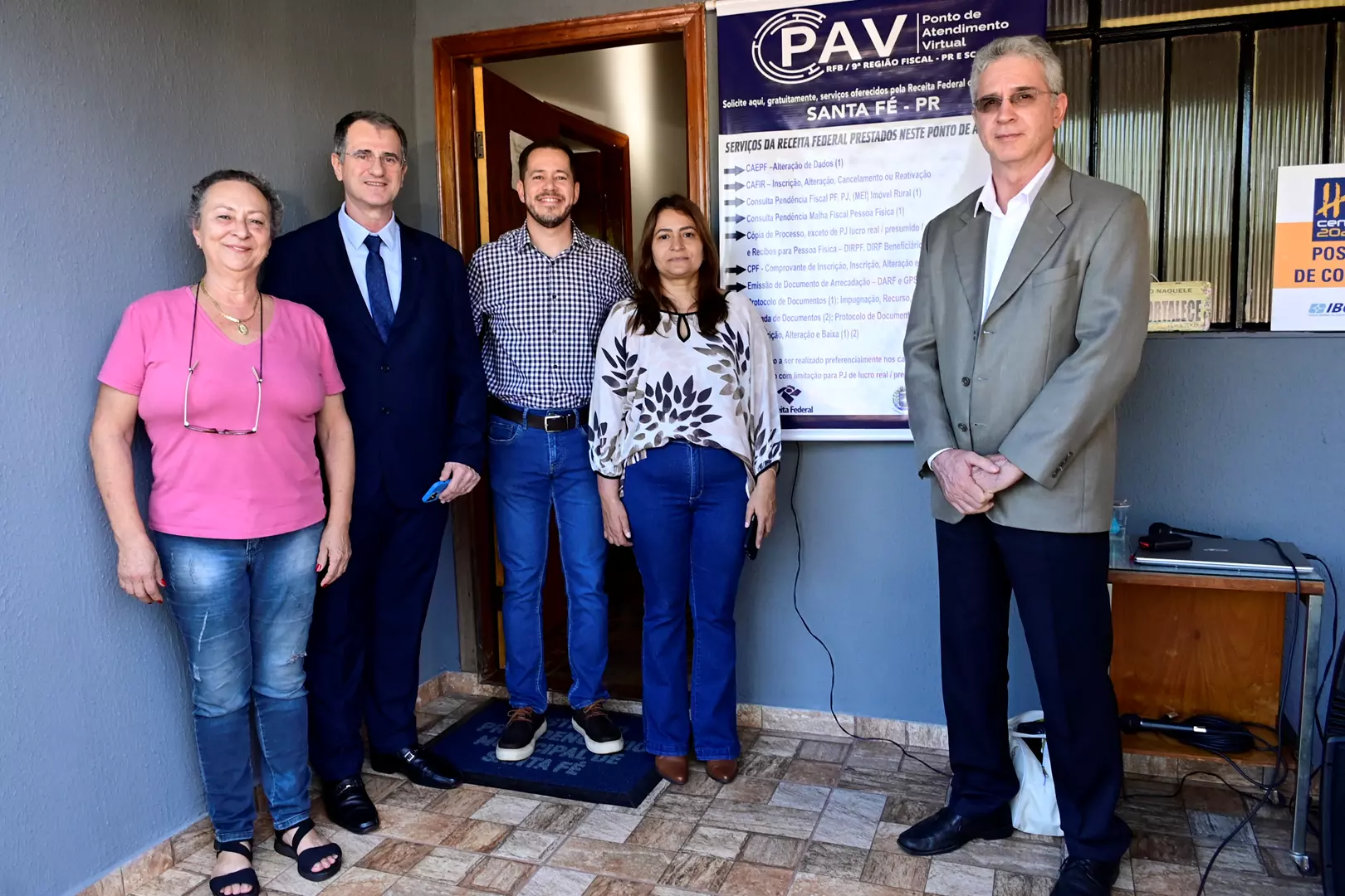 No mesmo local (Rua Ponta Grossa n. 612), também instalamos o PAV (Ponto de Atendimento Virtual) da Receita Federal do Brasil em Santa Fé, órgão que atenderá nossa comunidade em diversos serviços, evitando assim, que pessoas físicas e representantes de pessoas jurídicas se desloquem até Maringa em busca desses serviços.
